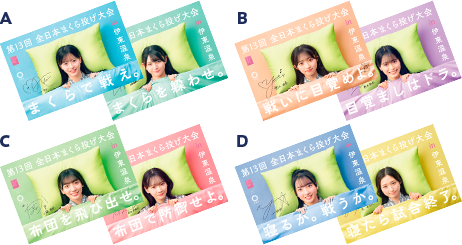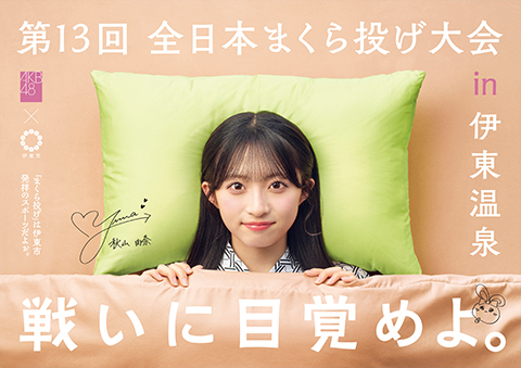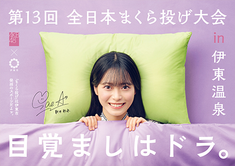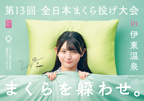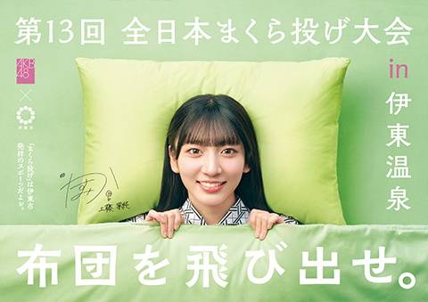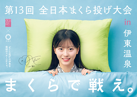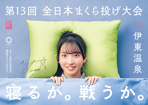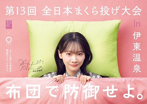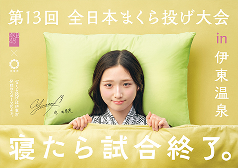 第13回全日本まくら投げ大会が2月22日・23日伊東市で開催されました。今年はAKB48の第18期研修生の8名が公式アンバサダーとして会場のマクラーたちに応援メッセージを送ってくれました。さらには、8人のメンバーが布団で寝ている可愛いらしいビジュアルがお目見え。その表情とは裏腹にメンバーが1対1でガチで戦おうとしている構図になっているとか。8種類のビジュアルがずらりと並んだ様は圧巻で、会場を大いに盛り上げました。2日間にわたる全国のマクラーたちの熱き闘いも必見です!